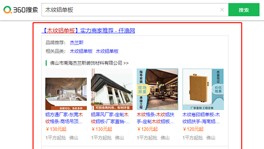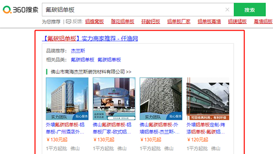 企業(yè)指定關(guān)鍵詞在360搜索結(jié)果首頁固定位置特型展示模式。PC端+移動端推廣全覆蓋,365天,全國地域,24小時不間斷展現(xiàn),實現(xiàn)了企業(yè)品牌和熱銷商品的雙重全方位的曝光效果。